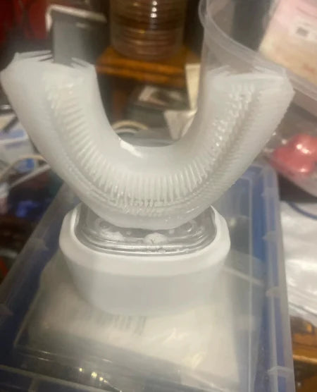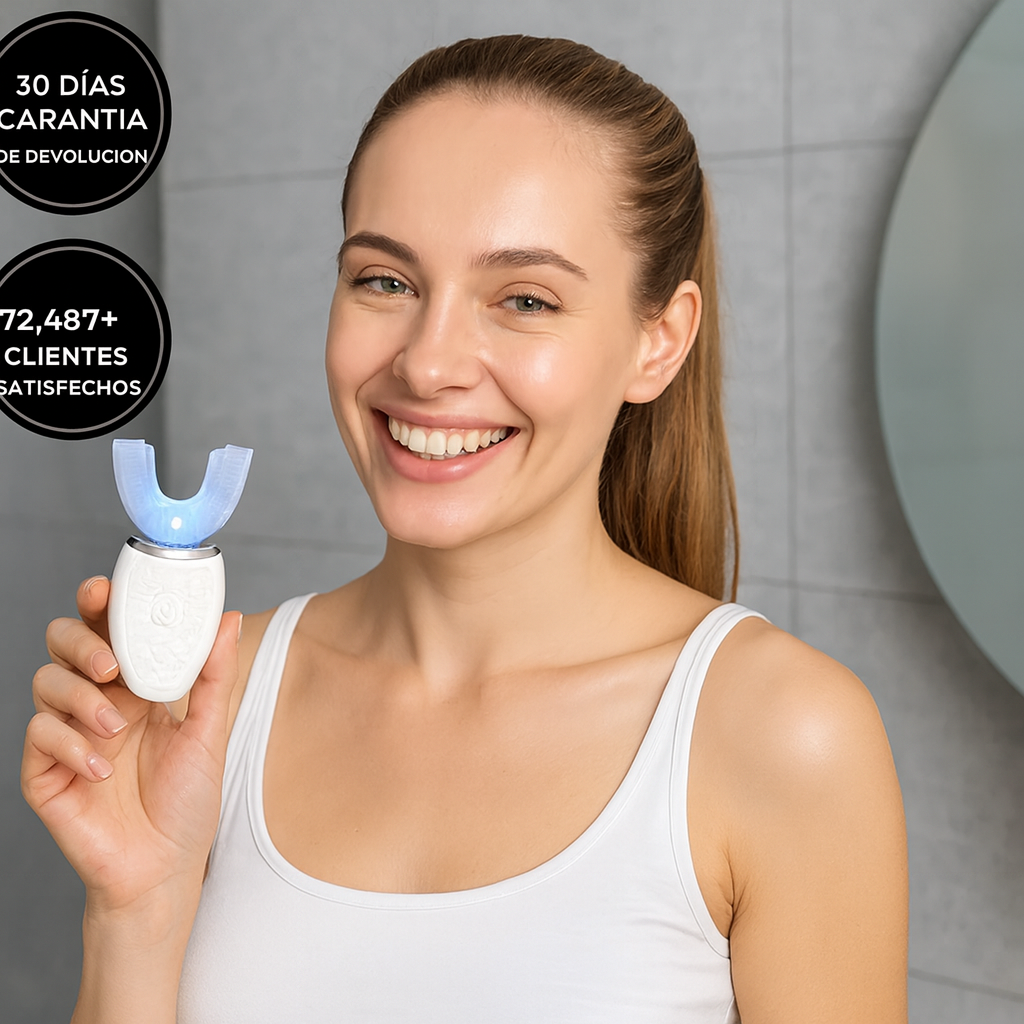 El cepillo utiliza vibraciones ultrasónicas combinadas con luz LED azul para eliminar placa, bacterias y manchas superficiales de los dientes. Su forma en “U” permite una limpieza profunda y uniforme de 360° en toda la boca.